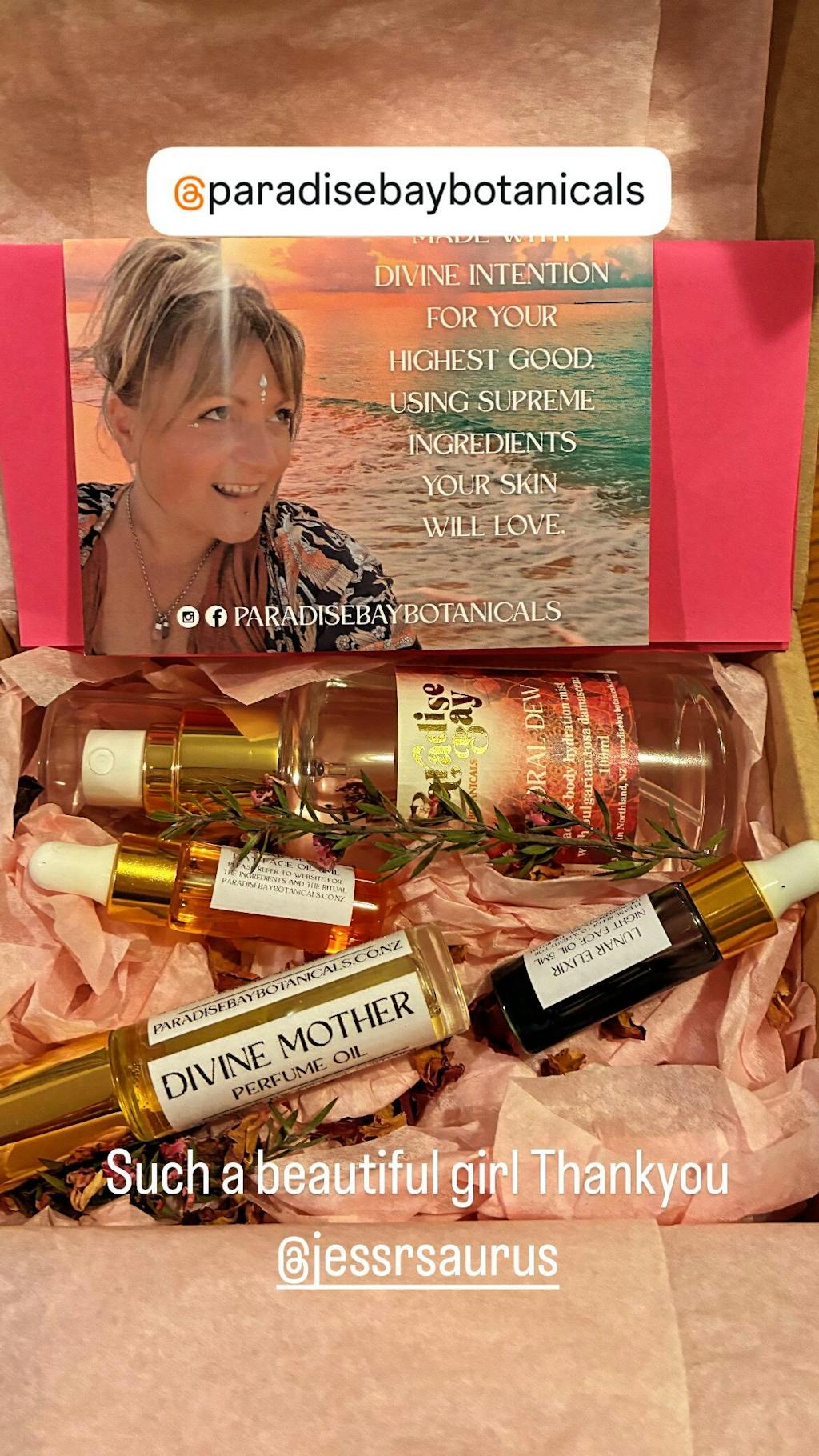 My daughter surprised me with a Mothers Day Gift Box that contained The beautiful floral Dew Spritz Spray. The Lunar Night Face oil . The solar serum Day Face Oil. And the Devine mother perfume oil. Oh my goodness. I have never felt so self indulged. The fragrances are rich and deep and heavenly. My old lady skin feels soft and plumped. I love that all the products come in glass. I love that the founder lives right here in whangarei. Well done Jasmine. Will definitely be recommending your products to everyone 🩵